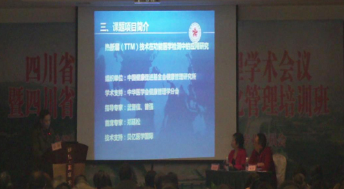 會議期間,陳剛主任詳細介紹了“熱斷層(TTM)技術在體檢人群疾病篩查及風險評估中的應用”多中心研究項目,該項目是由中國健康促進基金會委托、中國健康促進基金會健康管理研究所牽頭、中華醫學會健康管理學分會進行學術支持,于2013年9月在“第三屆全國健康管理示范基地建設研討會”上正式發布,課題的學術指導專家由中華醫學會健康管理學分會主任委員武留信教授、中華醫學會健康管理學分會候主任委員曾強教授擔任,其目標為旨在促進熱斷層(TTM)技術在體檢人群疾病篩查及風險評估中的應用發展。此項目通過利用熱斷層(TTM)技術,經過大量臨床研究和分析,對乳腺疾病、肺部疾病、肝臟疾病、心血管疾病、腦血管疾病和甲狀腺疾病等健康管理項目進行檢測監測、風險預測、預警與評估,建立熱斷層(TTM)在健康管理和體檢應用中的診斷標準、風險評估及早期干預等技術行業規范等目的。本項目的技術支持由貝億醫學國際提供。