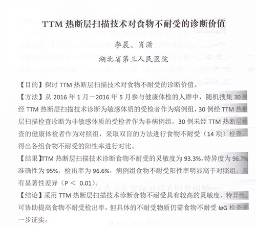 大會論文匯編收錄了湖北省第三人民醫院編寫的TTM熱斷層掃描技術對食物不耐受的診斷價值》,研究結果顯示采用TTM熱斷層掃描技術診斷食物不耐受具有較高的靈敏度、特異性。